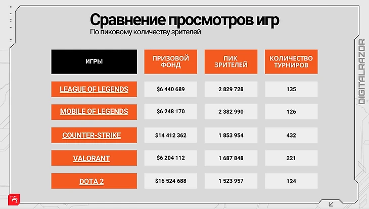 По данным сайта Esports Charts за первую половину 2024 года наибольшей интерес вызывает у зрителей и игроков следующая пятерка киберспортивных игр: