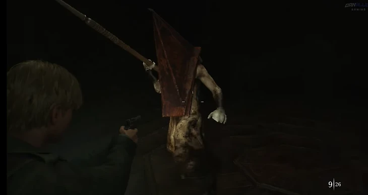Битва с Пирамидоголовым будет напряженная и тревожная. Его медленная походка и гигантский меч внушают ужас. Для противостояния монстру игроку предоставляется выбор между деревянной доской и пистолетом. Нанесение определенного количества урона по телу или шлему Пирамидоголового вызывает сотрясение земли, что приводит монстра в ярость и увеличивает скорость его атак. Оптимальная стратегия в этой схватке — поддержание дистанции и ведение огня только с безопасного расстояния. По прошествии некоторого времени зазвонит колокол, сигнализируя об окончании схватки. Пирамидоголовый покинет локацию через главные двери.