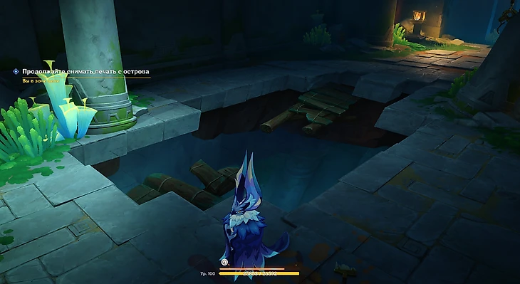 Отправляйтесь туда по воде в облике Кохолазавра. Как только окажетесь на территории бухты, услышите голоса, призывающие снять печать. В журнале заданий автоматически активируется квест «Тайна пляжа Теколоапан».