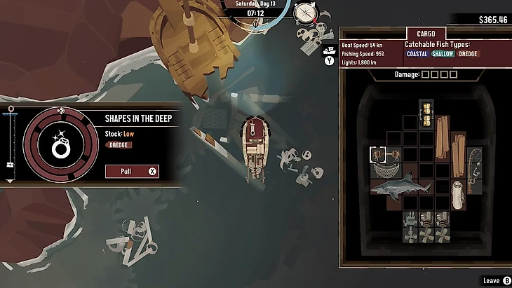 Пространство для нашего груза ограничено, и его часть уже занята мотором, фонарем и удочками. Это все впоследствии можно улучшать. Порой приходилось играть «в тетрис»: пытаться впихнуть невпихуемое, выкинуть ненужное, но частенько мне все было нужно! Пришлось чем-то жертвовать – выкидывать рыбу. Все цацки можно продать торговцу, который находится неподалеку от основной локации с маяком. А так все свое барахло можно закинуть в трюм, если причалить к какому-нибудь островку.