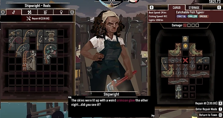 По мере прохождения нам откроются новые возможности, например, вылавливать сокровища и необходимые ресурсы для прокачки нашего судна. Это различные железки, металлические пластины, дерево и так далее. Корабельных дел мастер всегда поможет апгрейднуть нашу посудину или починить ее, если мы были не совсем аккуратными и повредили судно или на нас нападали с расчетом пробить дно. Но это все, конечно же, не бесплатно. На улучшение нужно много денег и ресурсов.