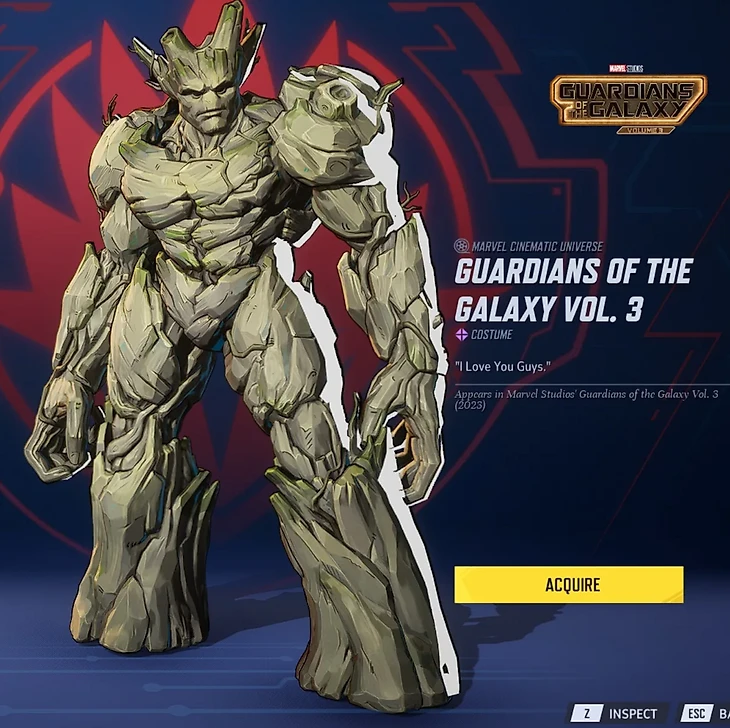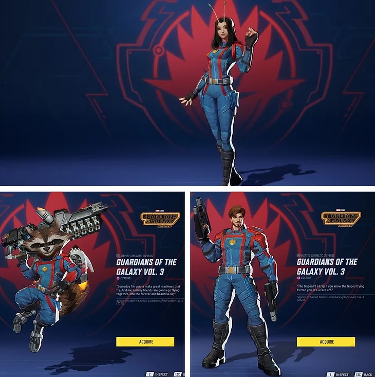 Все три скина объединяет культовый синий комбинезон с красными вставками. Если на Мантис и Звездном Лорде он выглядит стандартно, то образ Ракеты дополнен новыми мини-деталями на оружии и реактивном ранце.