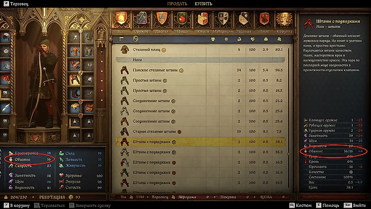 В меню торговли приоткройте окошко справа кликом по нему. Так вы увидите все статы одежды – нужно выбирать ту, у которой больше всего обаяния. Одежда дает бонус, а не полную характеристику – то есть полноценный бонус от всей одежды можно посмотреть в меню статов слева.
