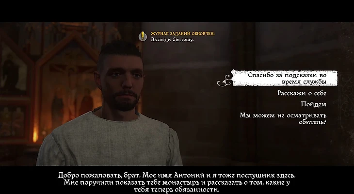 После обряда посвящения, в котором один из послушников поможет вам избежать ошибок, он представится как брат Антоний и предложит провести небольшую экскурсию по монастырю. Казалось бы, ничего необычного, но именно этот человек и окажется вашей главной целью – тем самым Святошей, который скрывается среди монахов.