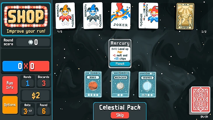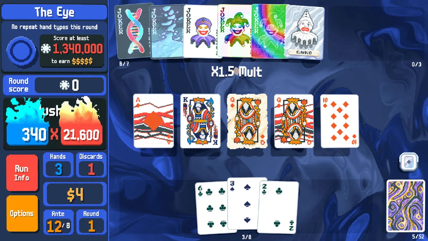 Задача игрока — с помощью комбинаций карт билдов и вспомогательных модификаторов перебить предложенную ставку blind. Если получится преодолеть blind игра пропустит вас в следующий раунд. При этом ставка каждый раз увеличивается, завершить забег можно в 24 раунде, набрав сто тысяч очков.