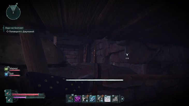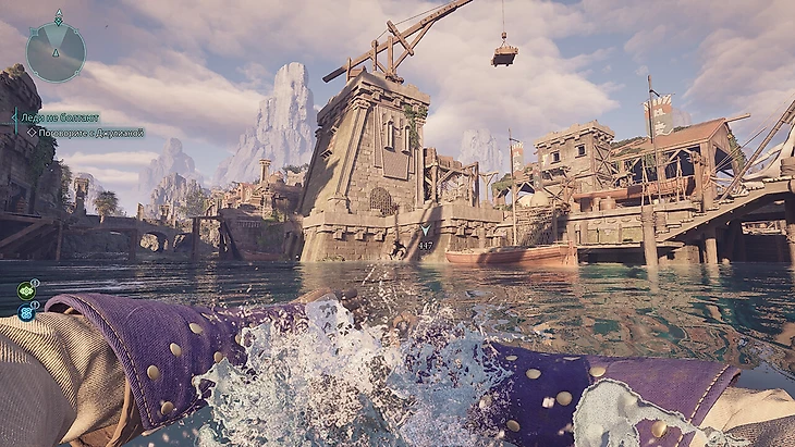 Если снижение скорости передвижения от пассивки предыдущей обуви вас не устраивает, можно подобрать другую обувь, причем недалеко. Вернитесь на причал и прыгните в правую сторону. Плывите в сторону города, пока не увидите дыру в стене (по центру скриншота).