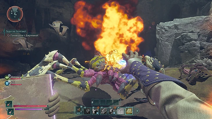 Подземелье небольшое и линейное, в нем можно собрать немного расходников по пути к боссу. Используйте огненные способности или прикажите Каю атаковать огнем проходы, закрытые паутиной. Если увидите дыру в полу, значит, вы на правильном пути. Вскоре вы выйдете к арене босса – сперва нападут маленькие паучки, а потом появится мать-паучиха Насиб.