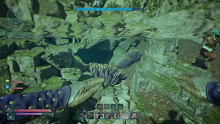 В этом месте нужно нырнуть. Там находится небольшой проход в пещеру.