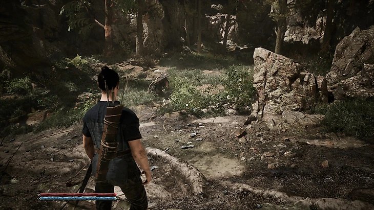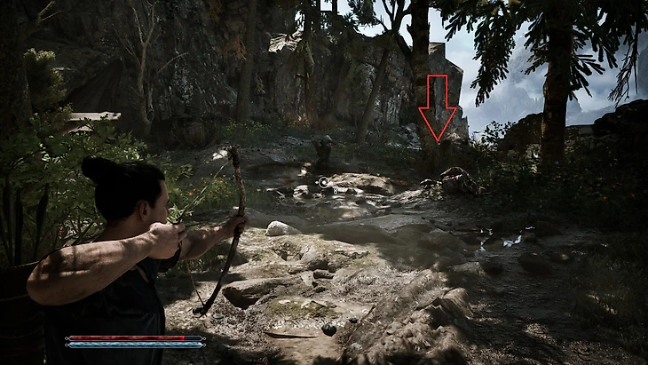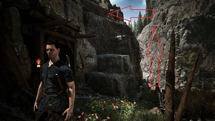 Вернитесь к лагерю у моста. Рядом с переправой есть неприметные платформы. Заберитесь по ним и окажетесь на большой поляне.
