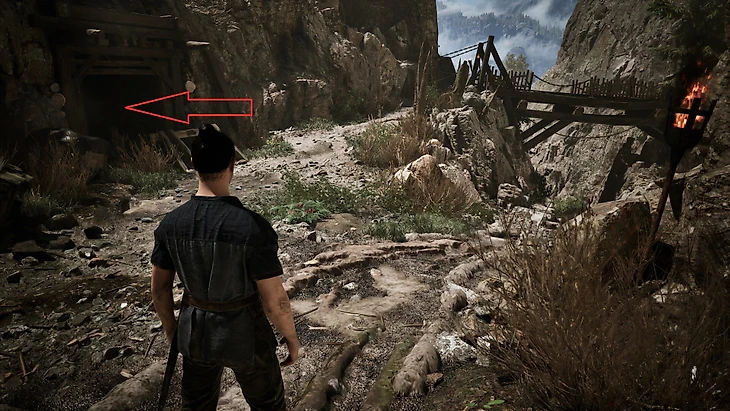 Продвигайтесь по тропе и увидите мост, который ведет в лагерь. Там вы и заночуете, но позже. Слева от моста есть пещера.