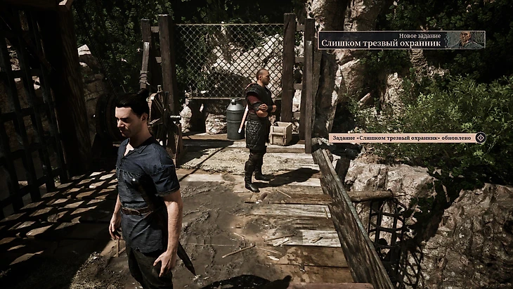 Бегите дальше и упретесь в ворота. Сверху стоит охотник. Дайте ему пиво и получите ценные сведения о мире. Если не взяли алкоголь в лагере, то за воротами есть маленькая стоянка. Там в сундуке лежит пиво.
