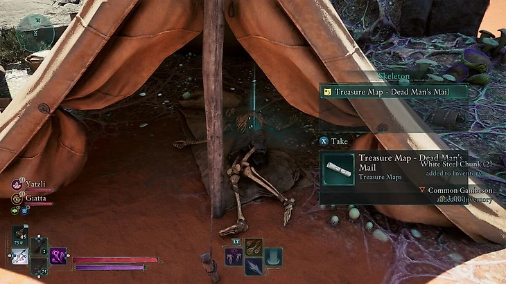 Одна из палаток в лагере окажется открытой. Внутри вы обнаружите скелет – молчаливого хранителя древних тайн. Обыщите его, и именно здесь вы найдете карту сокровищ. Однако, будьте готовы к тому, что путь к сокровищам будет полон испытаний, и сама карта лишь первый шаг на долгом пути.