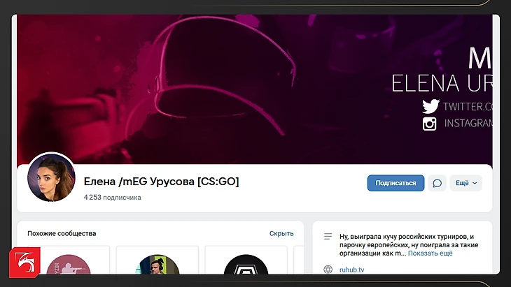 А это страница Елены mEG Урусовой – бывшей киберспортсменки, а ныне – кастера и ведущей студии аналитики ruhub CS GO.