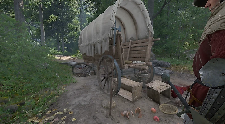 После этого вам необходимо будет найти труп священника – он находится на берегу ручья. Обыщите труп, возьмите стоящую около одной из телег алебарду и поговорите с Мятликом. Он позовет вас за собой и отправится в лесную чащу по следу половцев.