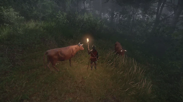 Перейдите через ручей и следуйте по следам, которые ведут в лес. Ориентируйтесь на отпечатки копыт на земле, и вскоре вы наткнетесь на пару коров.
