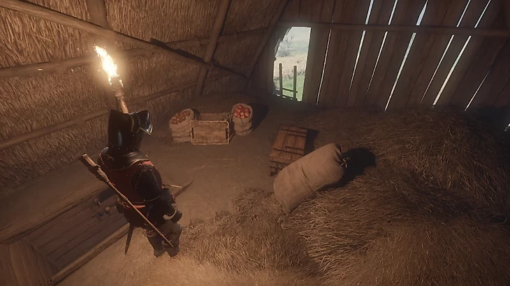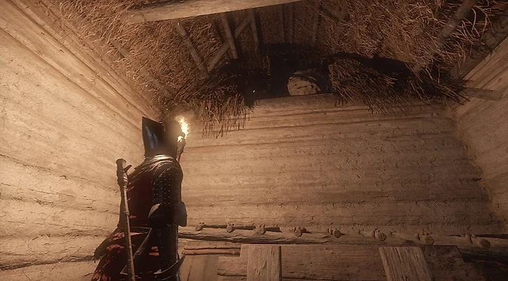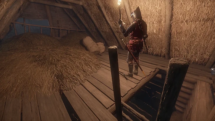 Зайдите в хлев, поднимитесь на чердак и поверните направо. Пройдите по деревянным доскам, и вы наткнетесь на лестницу, ведущую на чердак самого дома.