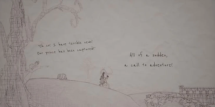 Начало может показаться скучным. Зои рассказывает историю спонтанно. В дневнике появляются записи с двумя персонажами, отправляющимися в лес. Где-то там в неведомых землях злые силы похитили принца, и теперь предстоит его спасти. Пока идет завязка, прыгайте на облака вместе с напарником по игре и готовьтесь к первой задаче.