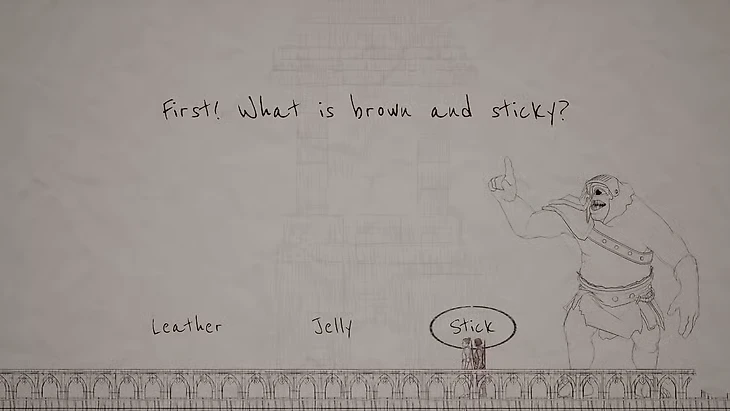 Вначале предстоит сразиться с птицами. Зои предстоит выбрать оружие между мечами, нунчаками и луком. После путь продолжается, и его преграждает тролль. Он стоит перед мостом. Нужно найти правильные ответы на его загадки и продолжить движение. Независимо от ответов результат будет одним и тем же. Тут нет никакого достижения. Но на всякий случай…