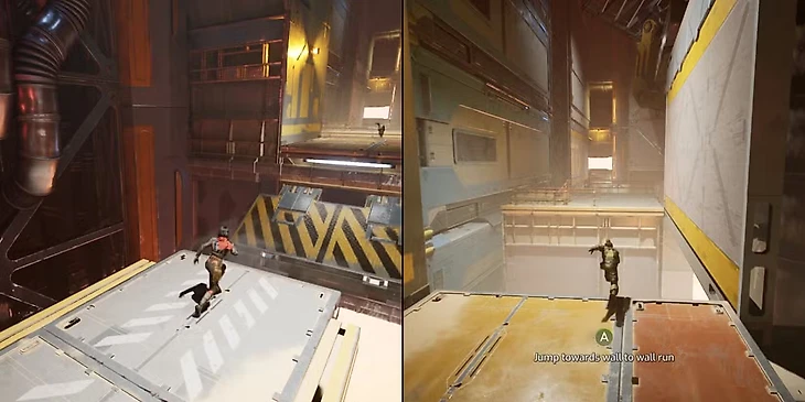 Бегите по стене, держась за выступы. Спуститесь вниз, затем используйте крюк, чтобы войти в открытый люк и пробираться по коридору. Там вы увидите столбы, через них нужно перелезть. Следом появятся новые. Они, как поршни, двигаются вверх и вниз, избегайте столкновения с ними.