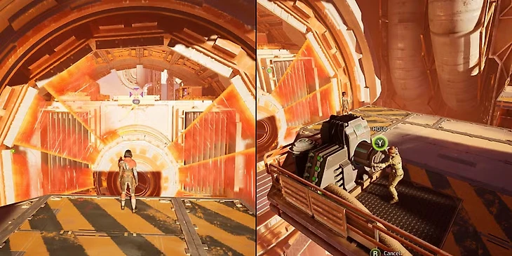 Вскоре перед вами окажется большая лазерная турбина. Слева расположена панель управления. Один из игроков должен взаимодействовать с ней и удерживать переключатель, чтобы замедлить движение турбины и открыть зазор. Второй игрок в это время, используя крюк, должен перебраться на другую сторону турбины. Как только он добрался, турбина сломается и позволит тому, кто держит переключатель, пройти дальше.