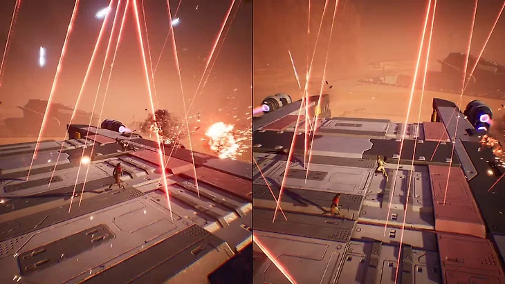Далее придется быть очень осторожными. Рассчитывайте время прыжков через огромные поршни, чтобы не оказаться раздавленными. Пройдите по очень тонкой перекладине. Поднимитесь по лестнице. Аккуратно прыгайте через постоянно поднимающиеся и опускающиеся платформы. Дальше встретите дверь, где нужно взаимодействовать с партнером, чтобы открыть ее. Окажетесь в посадочном отсеке. Вновь начнет стрелять вражеский корабль, но не беспокойтесь, это беспорядочная стрельба не нанесет вреда. Пули будут попадать в плитку под ногами, ее следует перепрыгивать. Когда оба игрока окажутся вблизи корабля, нужно зацепиться за его борт для доступа к управлению транспортным средством.