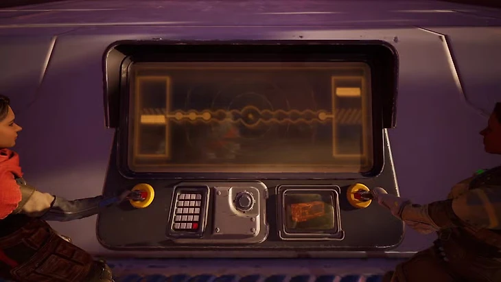 На вершине фиолетового корабля Зои и Мио увидят еще одну консоль. С ней нужно взаимодействовать, приняв участие в мини-игре. Оба персонажа должны нажимать свою кнопку каждый раз, когда желтая полоса с их стороны будет достигать середины. Так получится заполнить шкалу, движущуюся к центру экрана. Если один игрок достигнет середины раньше другого, его шкала снова начнет истощаться, поэтому важно синхронизировать действия и работать с одинаковой скоростью. Может понадобиться несколько попыток.