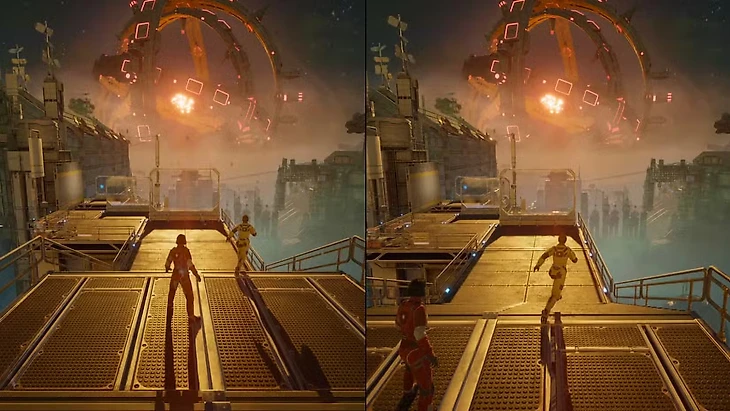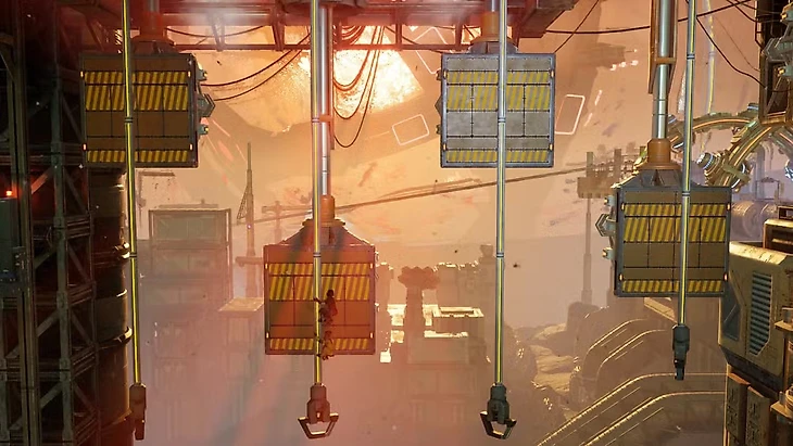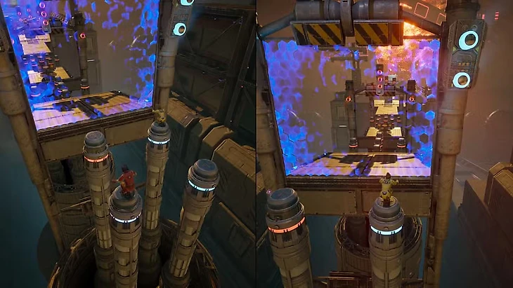 Преодолев препятствие, оба игрока окажутся перед лифтом с двумя консолями, которые нужно нажать одновременно. Тут же Мио и Зои окажутся в области с желтыми столбами. На них следует взобраться. Там есть защитный стеклянные щиты. Экран вновь разделится, когда добежите до следующего пространства.