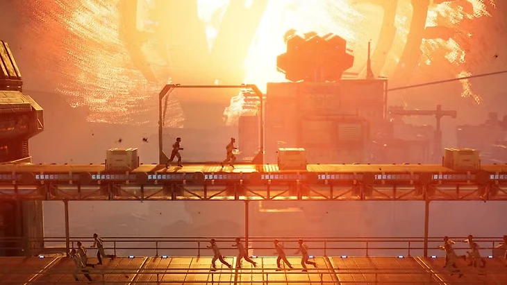 В самом начале следует пробежать через базу, прыгнуть от стены, активировать две консоли, чтобы оказаться снаружи. Дверь откроется, Зои и Мио увидят перед собой вдалеке коллапсирующую звезду. Ее смертоносный свет рассыпается повсюду, вы тут же оказываетесь в опасной зоне. Определить, что звезда вот-вот «выстрелит» легко. Она становится ярче, звук замедляется, появляется оранжевая аура. Как только она загорается, бегите в укрытие.