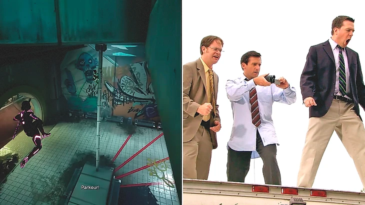 В начале 6 сезона шоу сумасбродный начальник Майкл Скотт начнет паркурить по зданию офиса со своими подчиненными, кошмаря выходками остальных коллег на рабочем месте и выкрикивая как раз «Паркур!» при каждом аляповатом движении. Вы могли видеть отрывок.