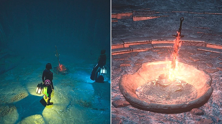 В сайд-портале про лунный замок (с атмосферой «Гарри Поттера»), близ которого нам нужно разыскать нескольких кошечек, можно проскакать по призрачным гробам и отойти немного от ведущей тропы на кладбище – тем самым найти закуток с каноничным костром из Dark Souls.
