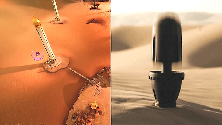 В самой первой побочной истории с вайбами «Принца Персии» мы попадаем в гиблый песчаный мир, напичканный барханными акулами – чуть что, и те выныривают из песков. Дабы отвлечь чудищ и проскочить мимо, нужно использовать эдакие столбы, распространяющие по поверхности дюн волны вибраций. Похожее устройство, но в миниатюре, мы могли видеть в экранизациях романа Фрэнка Герберта от Дени Вильнева.