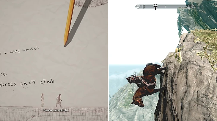 С тех же лошадей мы слезаем под предлогом рассказчицы из-за их неспособности лазать по горам. Но на опыте противоречащего физике скалолазанию на парнокопытном по отвесным скалам и каменным грудам в The Elder Scrolls V: Skyrim мы можем утверждать обратное.