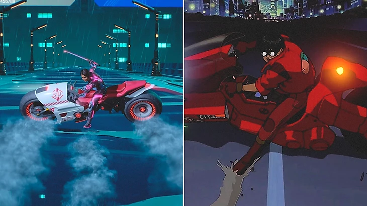 В первой истории Мио про киберпанк-месть вы наверняка помните мемную капчу во время погони по мегаполису будущего на гравибайках (в которых есть что-то от фильмов «Трон»). После угрозы детонирования этого футуристического байка вы перехватите на мосту новое средство передвижения и эффектно развернетесь на нем с дымящимися покрышками, в точности как это делал главный герой аниме «Акира». На таком же красном транспорте.