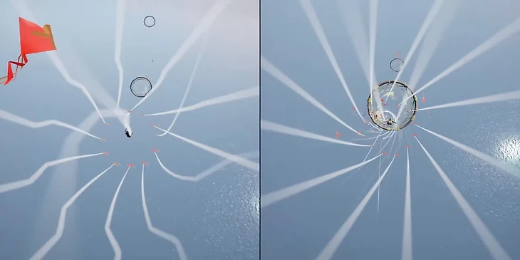 Задача: между Мио и Зои предстоит соревнование на скорость, где нужно прокатиться на зиплайне и пролететь через кольца в воздухе, заполненном воздушными змеями.