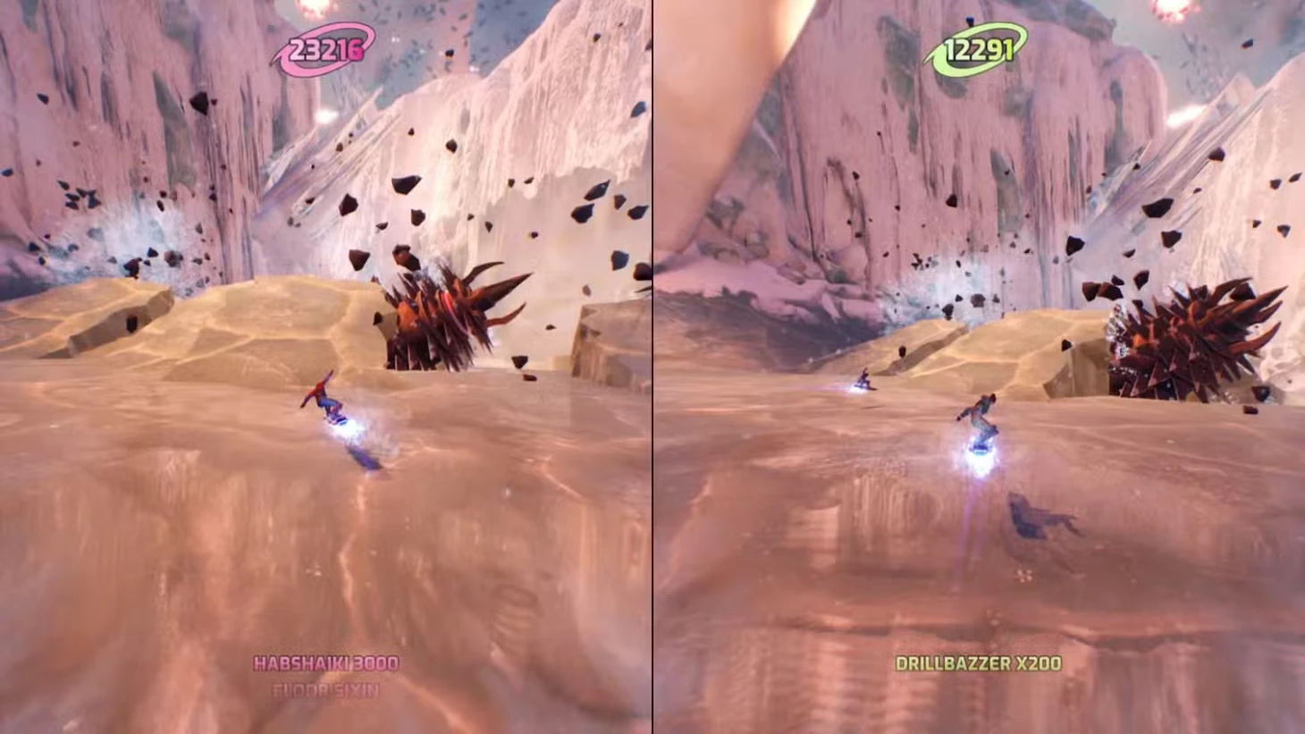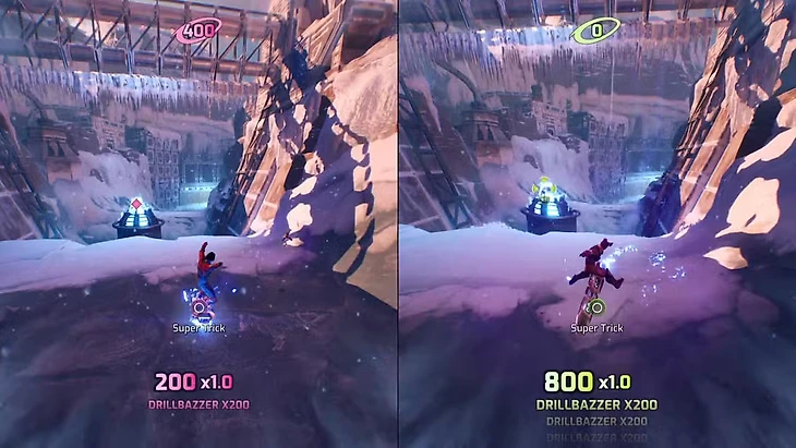 Побочное задание одно из двух в игре, где Мио и Зои соревнуются между собой. В этот раз победить помогут хорошие навыки управления сноубордом. Выиграет тот, кто наберет большее количество баллов. Для этого нужно владеть разными трюками и прыжками. В отличие от побочного квеста «Воздушные змеи» (Kites), где игрок, совершив ошибку, теряет жизнь, здесь он всего лишь зарабатывает штрафные баллы. Количество жизней не ограничено. Каждое падение или столкновение с препятствием вычитает тысячу набранных очков. Перечислим приемы, которые есть в арсенале игроков. Они помогут набрать как можно больше очков.