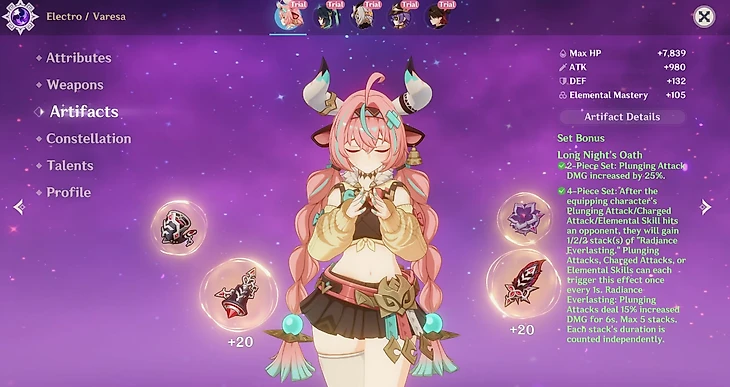 Артефакты набора «Клятва долгой ночи» идеально подходят персонажам, которые наносят основной урон с помощью атак в падении. Рассмотрим несколько бойцов, которые смогут максимально эффективно использовать сет: