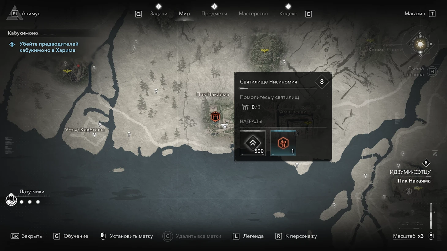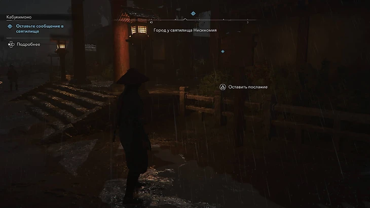 Для прохождения дальнейшей части квеста «Кабукимоно» в Ассасин Крид надо вернуться в святилище Нисиномия, где вы получили задание. Там потребуется оставить сообщение для Кабукимоно.