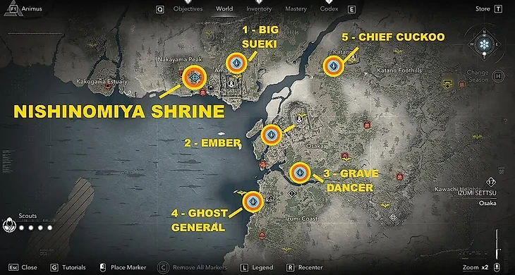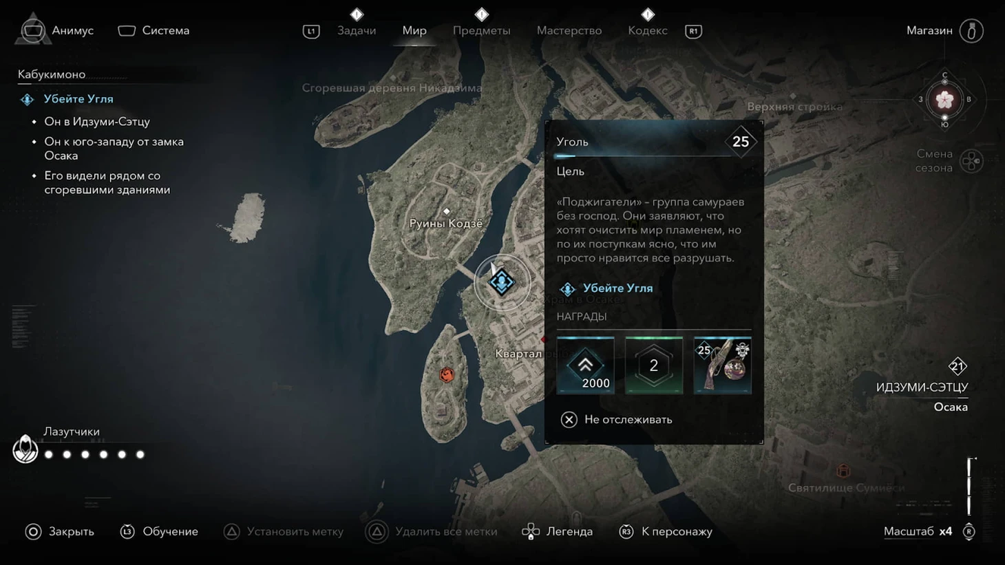 Свое прозвище ронин получил из-за страсти к поджогам. Для поиска надо отправиться к замку Осака. К юго-западу от него есть небольшой лагерь, в нем вы найдете свою цель.