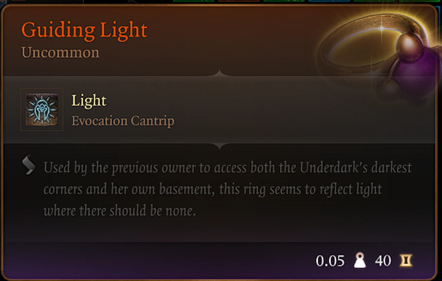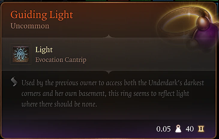 Кольцо под названием «Направляющий свет» (Guiding Light) представляет собой уникальный магический предмет, который позволяет своему носителю использовать заклинание Guiding Light. Это не боевое заклинание, и на первый взгляд может показаться, что оно не несет практической пользы. Но его назначение куда хитрее: оно используется как ключ, позволяющий обнаружить потайную кнопку на платформе лифта в башне.