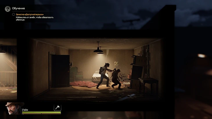 Начинаем с обветшалого убежища. Зомби там неспешно ломают баррикады, а из вещей только кровать и верстак. Вам точно нужны кухня, оружейная, медицинский стол и прочие важные штуки. Да и доски для укрепления обороны пригодятся.