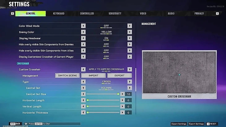 Если вы хотите использовать готовые коды прицелов, вы можете импортировать их в игру. Для этого нажмите на кнопку «Импорт кода прицела», вставьте нужный код в текстовое поле и подтвердите выбор. Прицел сразу изменится на новые настройки.