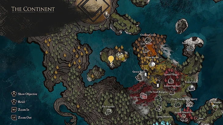 Третий потерянный жестраль становится доступен после начала второго акта, когда Эскье наконец-то учится плавать. Без этой способности до нужного места не добраться, так что не торопитесь – ждите сюжетного апгрейда. Как только плавание открыто, двигайтесь на восток от Желтого урожая и ищите небольшой остров рядом с подземельем Белое дерево.
