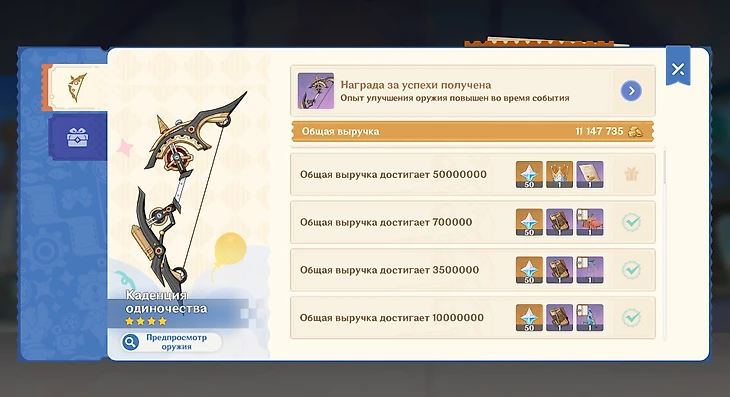 Каденция одиночества – четырехзвездочный лук в Genshin Impact. Его можно получить за участие во временном событии. Во время действия события лук получает бонус 1,5 к прокачке – то есть его можно будет прокачать быстрее, чем остальные четырехзвездочные оружия.