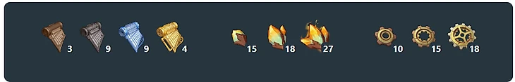 27 холодных осколков панциря, 18 теплых панцирей, 15 пылающих призмопанцирей – материал с термопанцирных хорьков, которые обитают в Натлане и Древнем море;