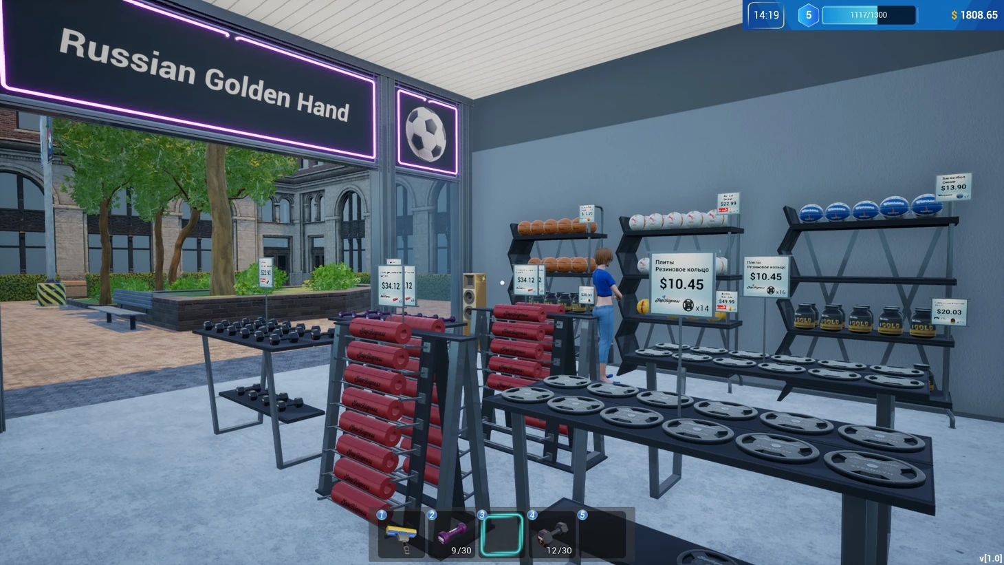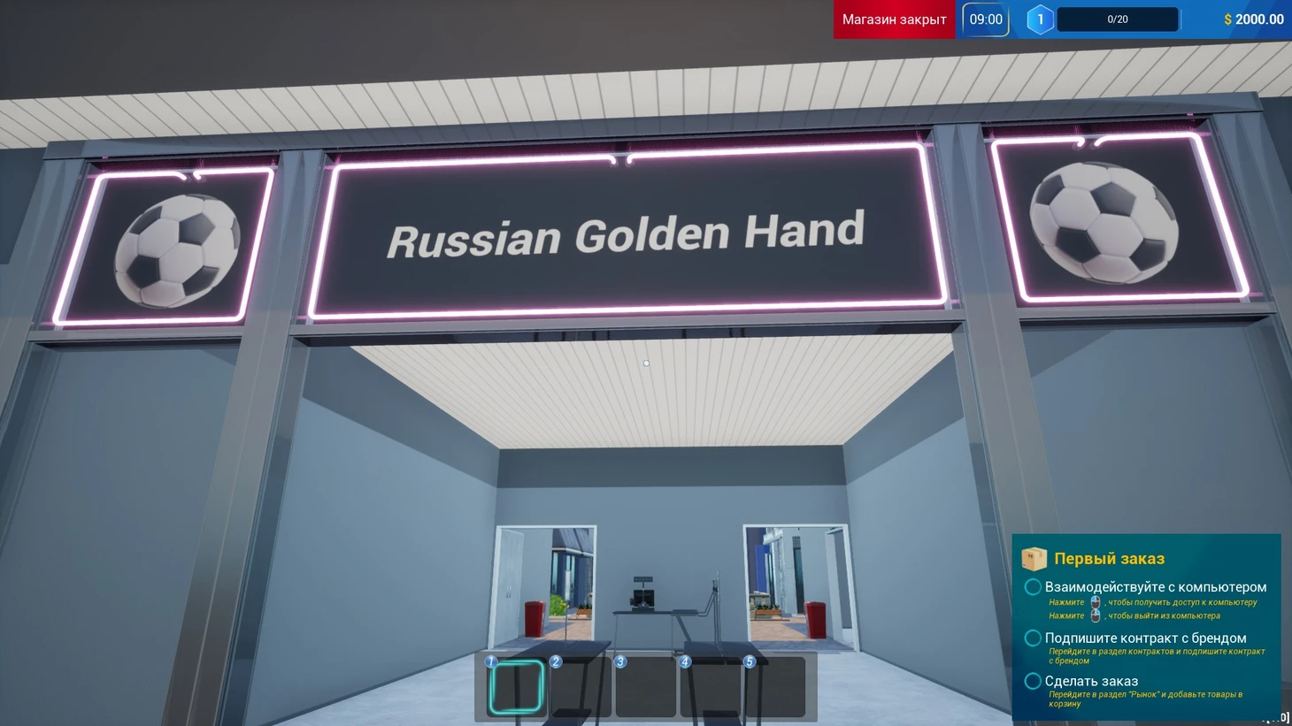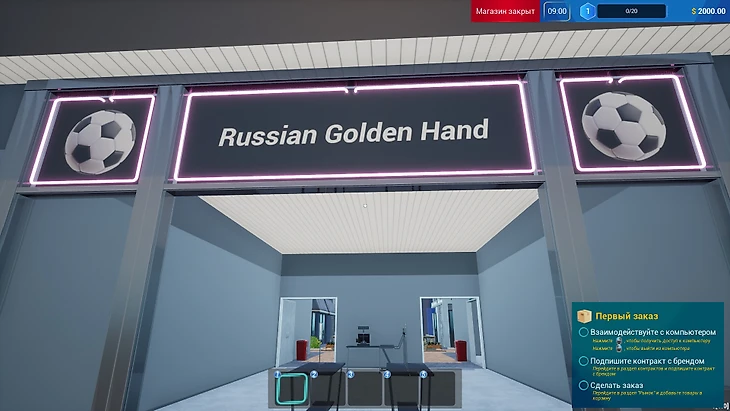 Sporting Goods Shop переносит игрока в уютный магазинчик спортивных товаров. Я назвал его Russian Golden Hand – конечно же, в честь Льва Яшина. Поначалу место пустовало и напоминало склад: рабочий компьютер, касса да пара полок. Игра не бросает в пекло и дает достаточно времени разобраться с механиками в простом обучении.