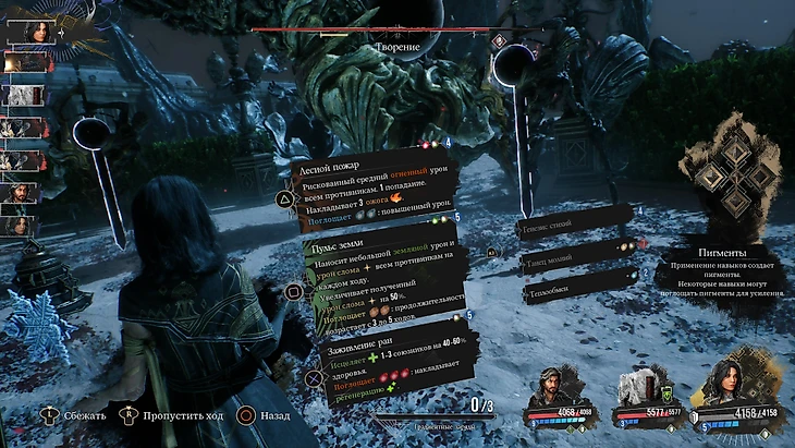 Одновременно в свой ход Люнэ может иметь доступ только к четырем пигментам. Они указаны справа от персонажа во время его действия.