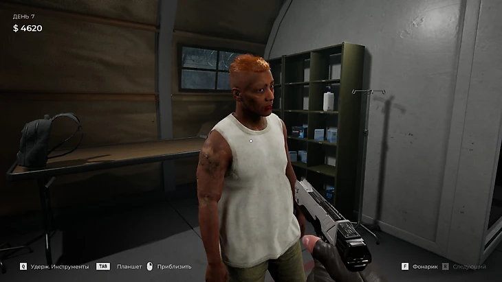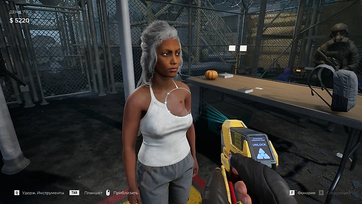 Через турникет проходит напуганный мужчина. Вы измеряете ему температуру, прослушиваете легкие, просвечиваете одежду, чтобы найти следы заражения. Он побит и кашляет, но в остальном здоров. Значит, в вашем пистолете останутся все пули. Парень идет в безопасный лагерь и по дороге чуть не плачет.