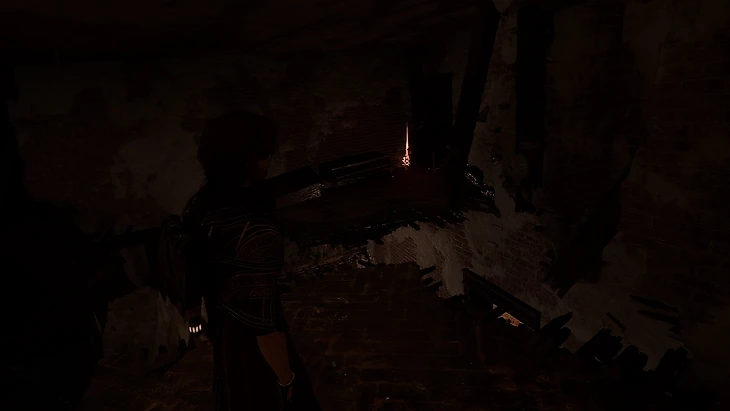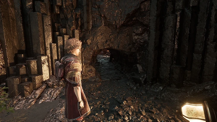 Дальше будет развилка: слева лежит журнал Экспедиции 50 и немного хромы – снова воспользуйтесь крюком и переберитесь через пропасть. Справа поджидают два врага с двуручниками, а еще дальше – два Рошера и жнец-культист. Если пойдете вверх по травянистой тропе, то попадете к шестигранным скалам. За ними спрятан пиктос «Мощь во спасение», который усиливает персонажа при здоровье ниже 50%. Рядом в ящиках лежит Цвет Люмины. Вернитесь на основную дорогу, следуйте по фонарям в темную пещеру, там снова пригодится крюк. За пропастью еще немного хромы, а после – веревка, ведущая к следующему флагу.