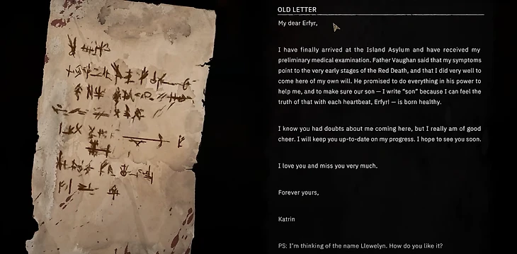 Продвигаясь дальше по Приюту, не пропустите еще одну камеру, в которой находятся скелеты взрослого и ребенка, прикованные к стене. Используйте отмычку, чтобы вскрыть дверь, и прочитайте записки отца Вогана (Father Vaughan’s Notes), лежащие на столе. Эти материалы придают квесту дополнительную эмоциональную глубину и раскрывают трагедию, произошедшую в этом месте.