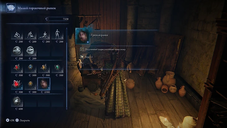 После того как вы разблокируете Герцогиню, отправляйтесь в Малый Горшковый Рынок в Крепости Круглого Стола. У местного торговца необходимо приобрести реликвию «Грязная рамка», которая стоит 1500 мрака.